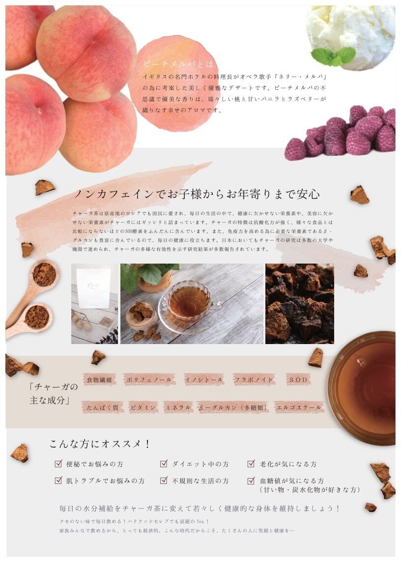 Beautyeeのチャーガ茶は100%ロシア産のチャーガに、イギリス生まれの上品なデザートで歴史のある甘さと甘酸っぱさを兼ね備えたピーチメルバの香りをブレンドし、紅茶のような上品な香りに仕上げています。