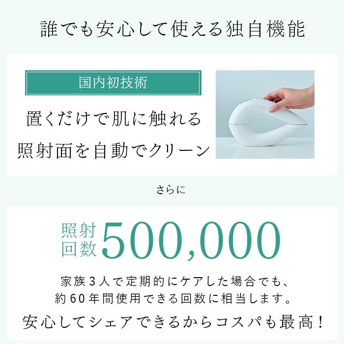 本体を付属スタンドに置いておくだけで、わずか2分のうちに自動で照射面をクリーンにできる、国内初のテクノロジー「オートクリーンシステム」。インテリアにもなじむスタイリッシュなデザインは、いつでもすぐに使えるだけでなく、つねに清潔さを保って黒ずみ・肌荒れなどの心配も抑えてくれます。