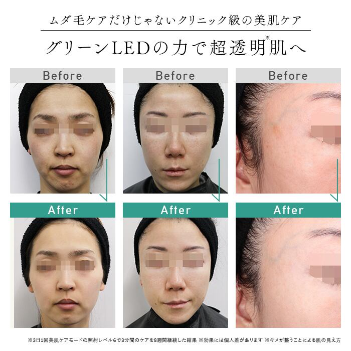 ムダ毛ケア・美肌ケア・アクネケアと一緒に「透明肌※1ケア」も叶えられる1台4役を実現した、 IPL※2とグリーンLEDを同時照射する国内初テクノロジー「デュアルディープアプローチ」。 使うたびにグリーンLEDが肌深部※3へと効果的にアプローチし、これまで見たこともないような 超透明な肌※1と出逢わせてくれます。