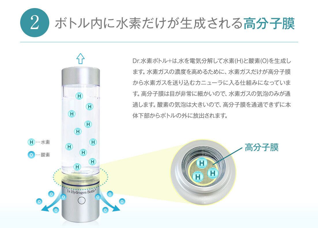 Dr.水素ボトル+は水を電気分解して水素(H)と酸素(O)を生成します。水素ガスの濃度を高めるために、水素ガスだけが高分子膜から水素ガスを送り込むカニューラに入る仕組みになっています。高分子膜は目が非常に細かいので、水素ガスの気泡のみが通過します。酸素の気泡は大きいので、高分子膜を通過できずに本体下部からボトルの外に放出されます。
